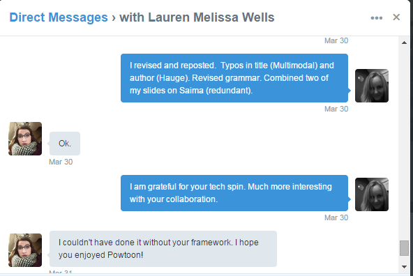 With Twitter direct messaging, Lauren and I were able to connect when it was convenient for each of us. We made a basic plan and exchanged e-mail addresses. Next, I started a Google Doc and shared it with Lauren in “can edit” mode. I summarized the readings and Lauren inserted her own ideas. Through Twitter, we divided up the readings and came up with a general theme.