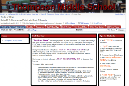May 5, 2015May 5, 2015 LibGuide for Documentary Filmmaking Project For my final project in EDC534, I created a customized website (LibGuide) for our school’s grade 6 documentary filmmaking project: For those interested in process, here’s a link to my Storify: Share this: Click to share on X (Opens in new window) X Click to share on Facebook (Opens in new window) Facebook Like Loading... Related
